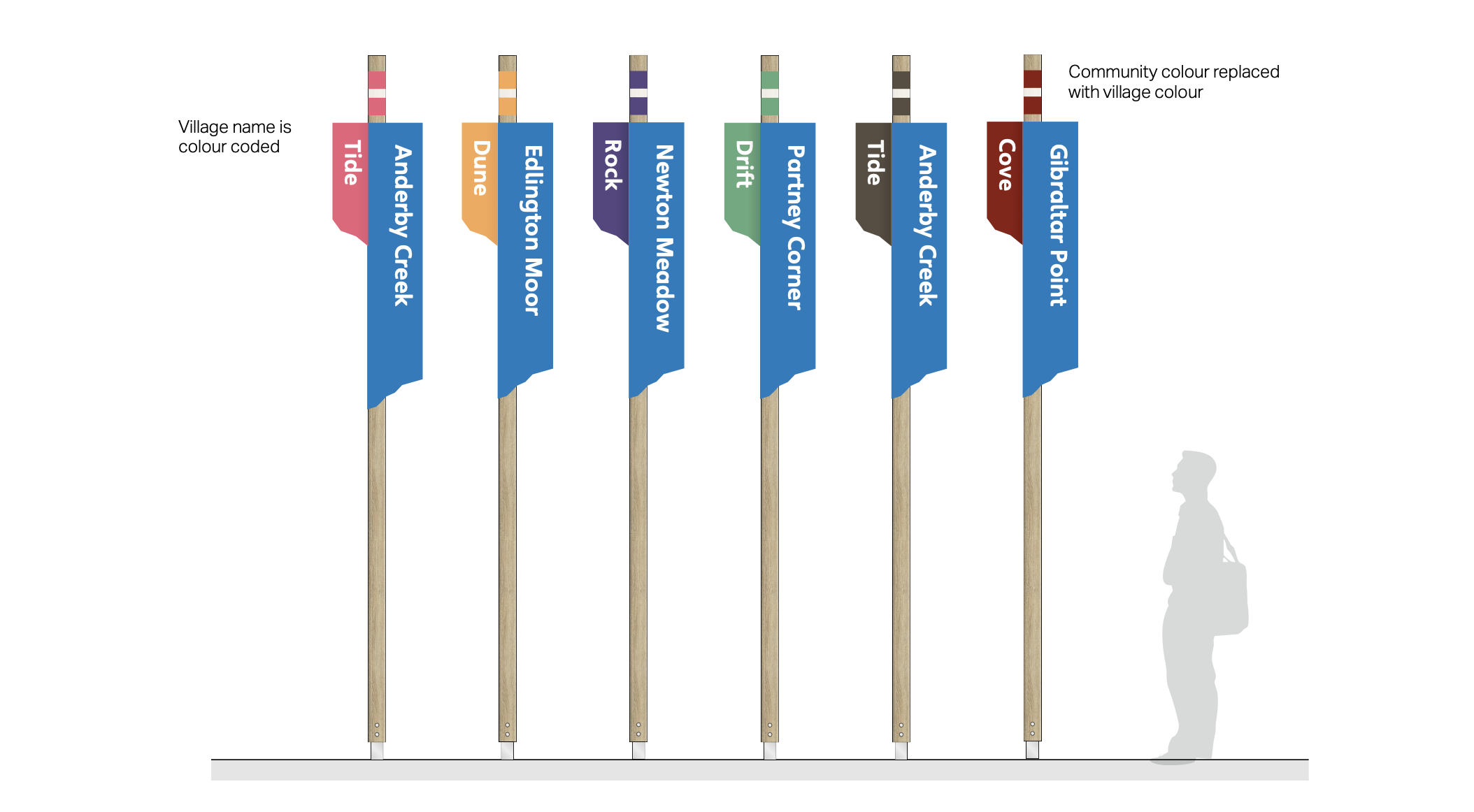 A simple zoning structure, supported by distinctive community markers, makes every area easy to identify, easy to describe, and easy to remember. Colour, naming and hierarchy work together so guests can orient themselves instantly, whether they’re driving to their caravan or walking to the pool.